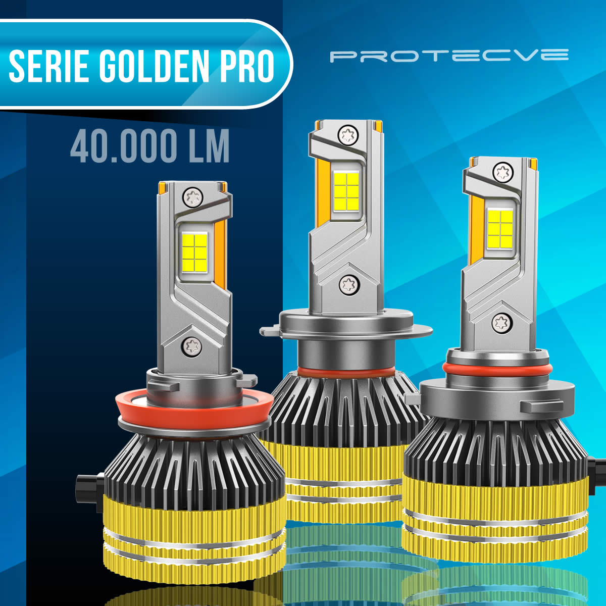 La serie Golden PRO posee una iluminación de 40.000 lúmenes, es nuestra serie TOP y esta diseñadas para personas que por diversas razones (traslado habitual por zonas muy oscuras, papel ahumado muy oscuros, personas con limitaciones visuales, etc.) requieren unos niveles exigentes de iluminación. Esos bombillos pueden ser instalados en carros, camionetas, camiones y autobuses tanto a 12V como a 24V. Todos los componentes están fabricados con materiales de primera calidad, lo cual le permiten tener una vida útil de 30.000 horas, además de disponer de 12 meses de garantía. Estos bombillos poseen una resistencia al agua de IP68. La instalación de este bombillo es muy fácil ya que no requiere ningún tipo de adaptación.